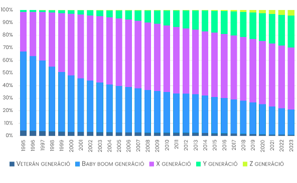 Helyüket átvette az X generáció: az 1960 és 1979 között születettek számítanak a legnagyobb tulajdonosi rétegnek. Többségük a rendszerváltást követő évtizedben vált cégalapítóvá. Arányuk – 33 évvel a rendszerváltást követően – 2023-ban esett 50 százalék alá. Igaz, csak 49 százalékra.